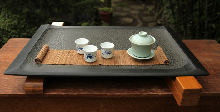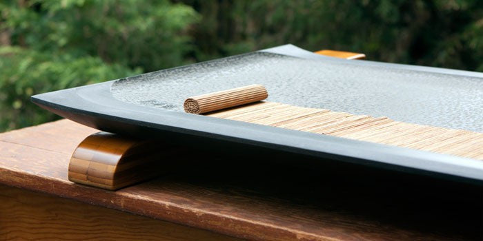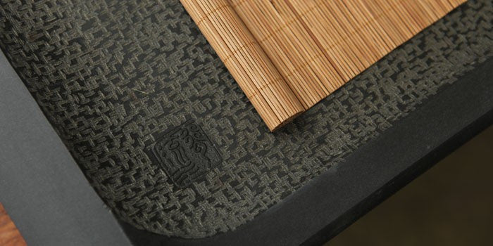 Carved from dark basalt, the tray’s surface is carved to resemble the interlace of woven bamboo mats. The tray is supported by two asymmetrical supports of natural bamboo lumber, made from laminating multiple strips of bamboo together to form a solid and contrastingly beautiful foundation for the stone tray. A gradual slope drains water towards a line of small outlets near one edge of the tray.